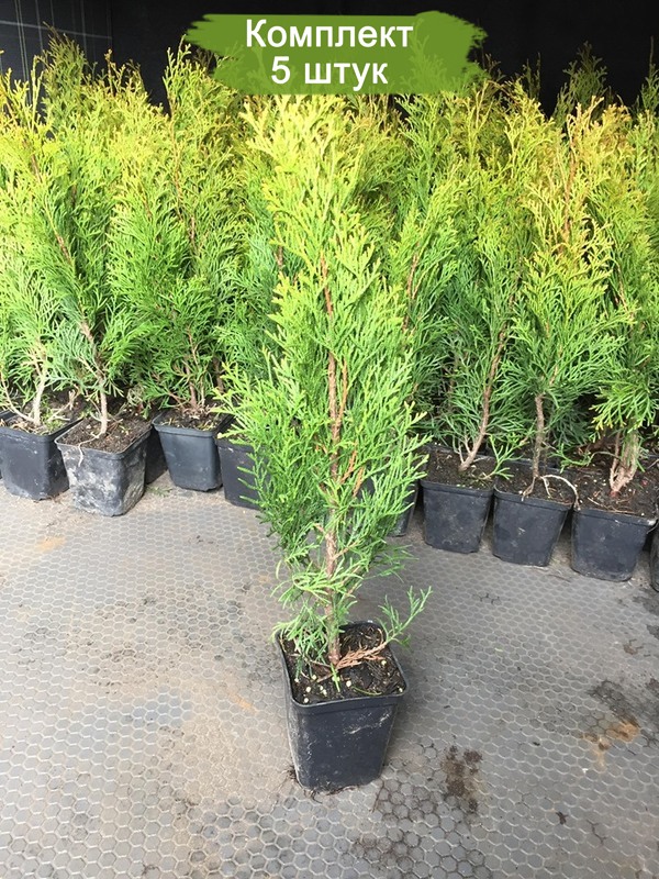 В комплект входит 5 саженцев туи 'Смарагд' высотой 40-60 см, что позволяет создать непрерывную изгородь длиной до 2-3 метров.