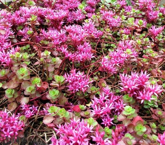 Очиток ложный 'Кокцениум' — это многолетнее почвопокровное растение, которое станет ярким акцентом в вашем саду. Его густые ковровые заросли достигают высоты до 15-20 см и образуют плотные подушки из мелких, мясистых листьев насыщенного зеленого цвета. В период цветения, который приходится на июнь-июль, растение покрывается обильными соцветиями ярко-розовых или красных оттенков, привлекая внимание и создавая эффектный контраст с зеленью.